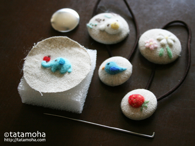 色の付いたふわふわの羊毛を布の上で刺し固めて