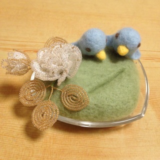 ハート型のフェルト芝の上に青い鳥が仲むつまじく並んでいます。